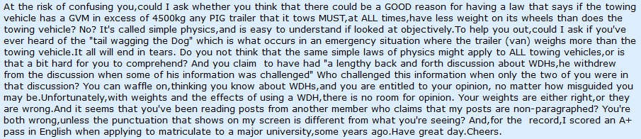 But rather than post a reasonable response he drags out the old chestnut vehicles over 4500kg cannot tow pig trailers, which has absolutly nothing to do with the comon vehicles used today towing caravans, And I understand that when Yobarr posts a non paragraphed respose which is very hard to read is because he using a tablet I presume, but that issue could be avoided if he selected within his settings to go to the full site.