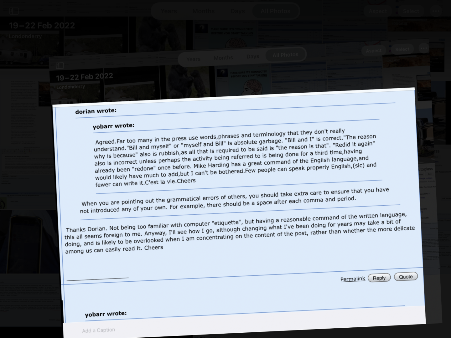 As have others, I have suggested to our Yobarr to use the space bar paragraphs and punctuation on several occasions to no avail. I liken it to wearing a hat at the dining table, where it doesnt stop you eating it is just unacceptable, rude and displays no respect for others at the table.