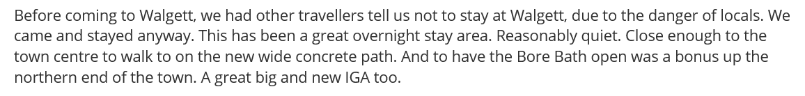 Have heard that many conflicting reports about Walgett in NSW -eg do not stay there under any circumstances, great place to stay would highly recommend. So, in short, is it a good place to stay for one or two days or just keep driving?