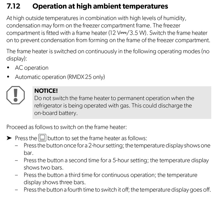 We have a Dometic RMDX21 three way fridge which is not working on 12 volt at the moment. I am still waiting for a new controller part and have been for more than 5 weeks and it could be another 5 weeks for all I know as there are no parts in Australia. Fortunately it is still under warranty. It turns out the controller corroded but could have been avoided if I knew something I was never told. The van was 18 months old when I bought it and even the previous owner had not been told by the dealer about one of the fridge buttons. See the screen shot attached with the button highlighted by a red arrow. Also, the extract from the manual. The fridge repair people said I should press the button at least monthly, if not weekly to heat the controller to remove condensation on it, especially in humid conditions. I wish I knew before.