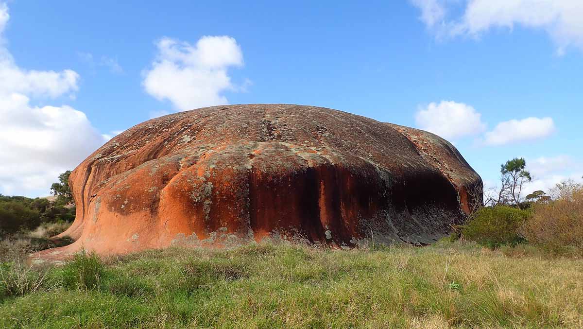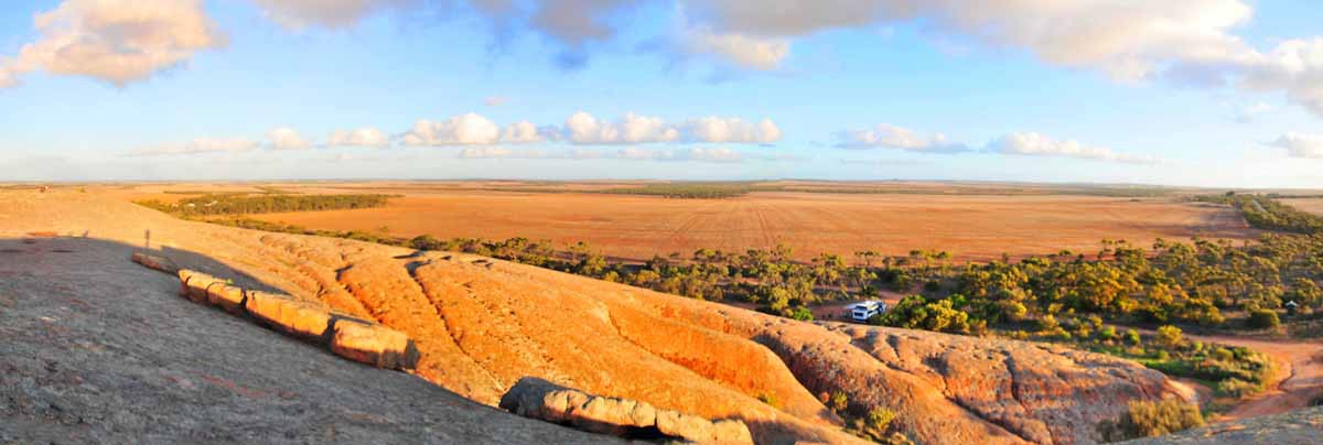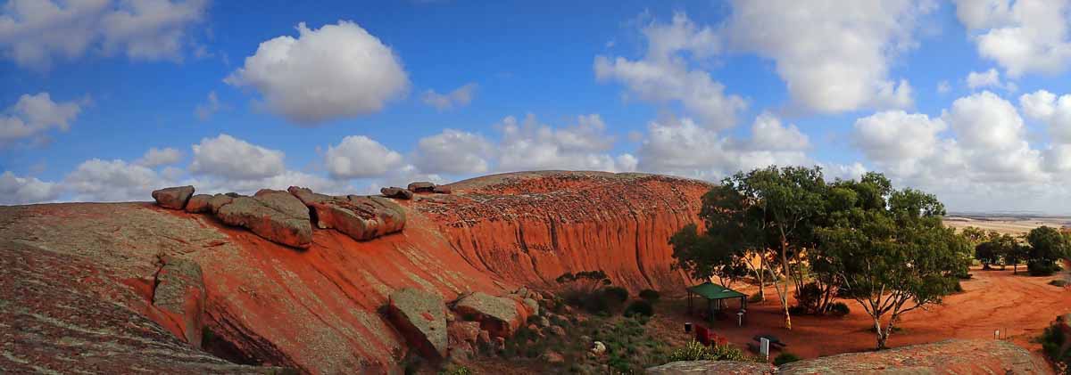 Pildappa Rock, Eyre Peninsula, Sth Aust, 15 klms North of Minnipa. Great place to camp, spectacular scenery around the rock, and from on top. Limited facilities, donation fee, 2 toilets, lots of camp sites, and protected from most winds, but best avoided in the hot weather. Unusual sound effects created as when somebody talks atop the monolith, it sounds like they are next to you at the bottom......dont fart ?