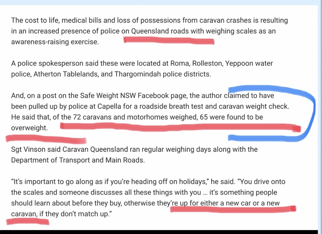 Just found this elsewhere on the forum, and have decided to put it up here as probably many people, like me, don't generally read everything that is posted in various places on the forum. Interesting that over 90% of travellers didn't know or didn't care that their vehicles were overloaded, unsafe and uninsured. Sad state of affairs which corresponds with my own observations whilst travelling. Speed doesn't help either. Recently I met a couple of caravanners who were in a big rush to "Do the lap", proudly announcing that they had left the Vic border 5 DAYS earlier, "done" South Australa, seen everything there is to see on the Nullarbor Plain, passed through Norseman, Widgiemooltha, Coolgardie, Yellowdine etc and were in Southern Cross, having already travelled over 600km that day, before 2pm! Planned to be in Port Hedland in a couple of days. Other than being able to say you'd "Done the lap" why would you bother as you would not have seen or learned anything at that speed. Pointless, me thinks. Cheers