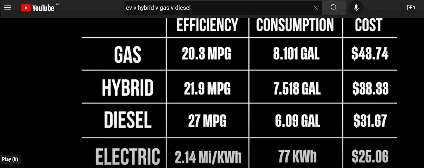 The chart that I posted previously showed the EV was about $6 cheaper than the diesel, a futher $6 more for the hybrid, and the petrol another $5 behind. Interesting points is the diesel pays a surcharge for choosing it, the hybrid like other 2 dont get a the tax benefit that the Ford buyers get.