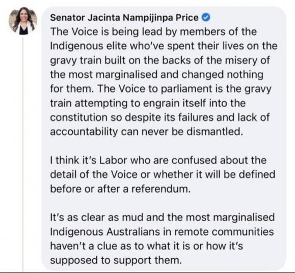I listened to the entire maiden speach of Jacinta, for which I was impressed. It was the most revelent speach about the plight of rural indigenous people who if the Voice was passed, nothing would change for them.