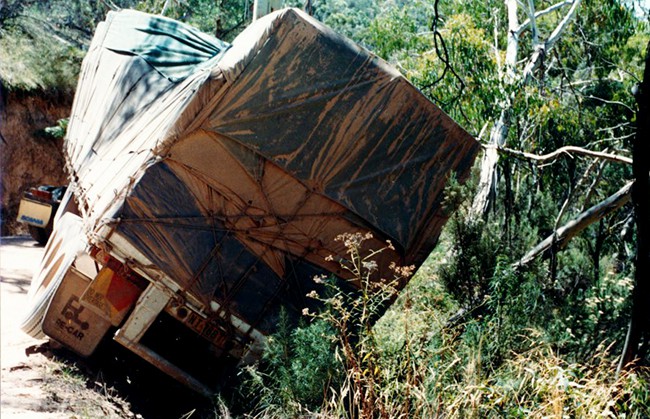 There was a massive drop off,amazing he got down the road as far as he did.he was waiting for heavy haulage to come down from Eden. we managed to squeeze past.