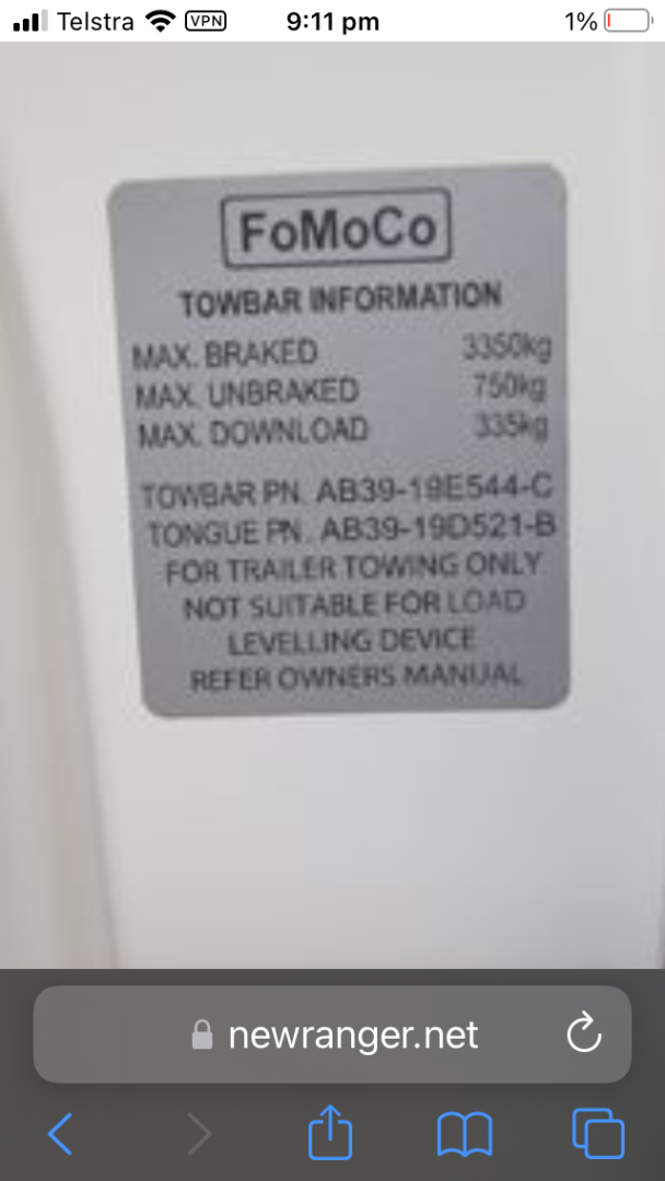 The Ford Ranger has a Ford towbar rated to 3200kg and there's a sticker on the drivers side door pillar