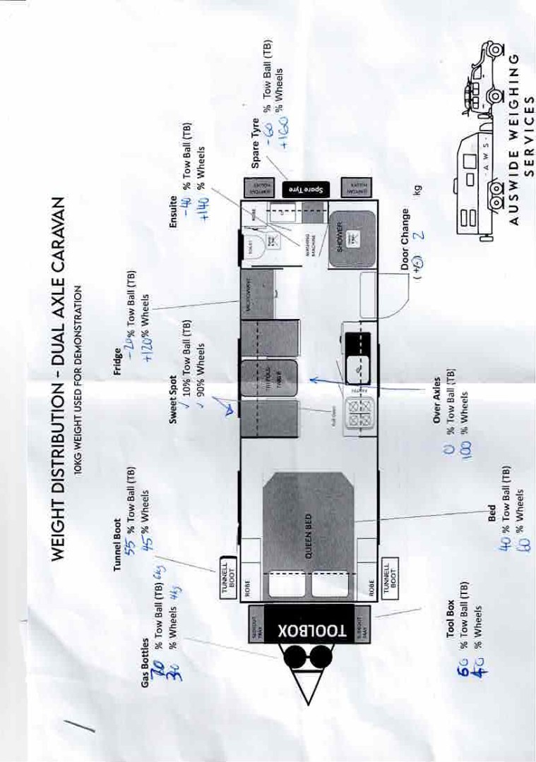 I was very pleased with their thoroughness and the time that they took explaining things to us. The owners are a young couple who are about to hit the road in their own van with 2 small kids and their equipment in tow. If you happen to see Auswide Weighing Services out there and are looking to get your rig weighed I can fully recommend their service.. Attached is a diagram that they gave to us on the change a 10kg test weight made when put at different locations in our van.