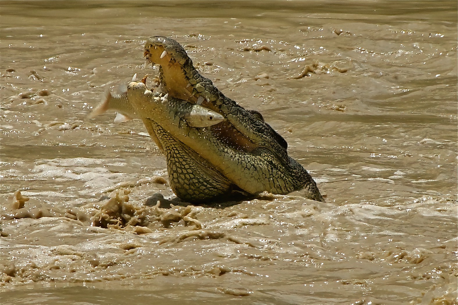 The crocs at Cahills are big. Haven't been there since 2009. Some croc warning signs refer to Estuarine Crocodiles. Some to Large Estuarine Crocodiles. Cahills crossing is the only place I've seen a sign which warned of 'Very Large Estuarine Crocodiles! We spent many hours at that crossing at 'change of tide' times over several days watching the crocs feed on the mullet crossing the causeway at low water. Far better than the paid tours with chickens dangled on a line. I have a pic of one with a mullet somewhere. Aha - found it! Camera back then was a Canon superzoom with a very small sensor.