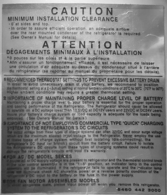 SYSTEM TO THE REFRIGERATOR'S DC CIRCUITS age from these types of charge systems can often 32VDC and occur surge voltage este traximum allowed input voltage to the Refrigerator. Never employ the use types of charge system without first isolating (dis-connecting), the er's DC input for branch) circuit from the battery circuit. Failure to isolate rator's DC circuits from these types of charging systems could result in retrigerator's circuits and void it's warranty."