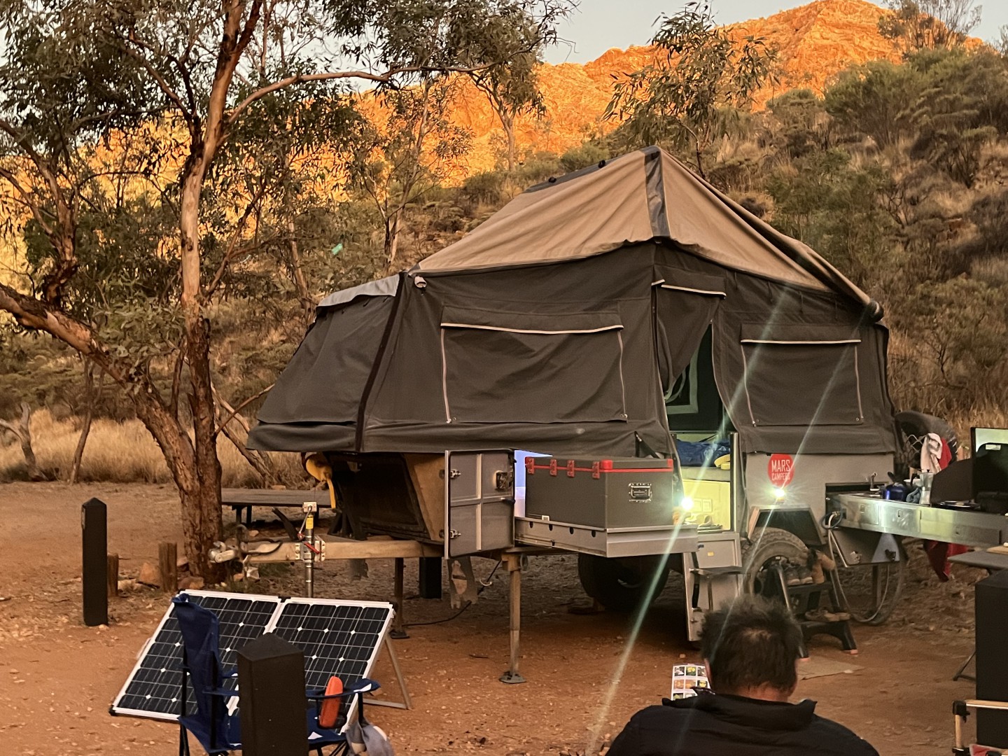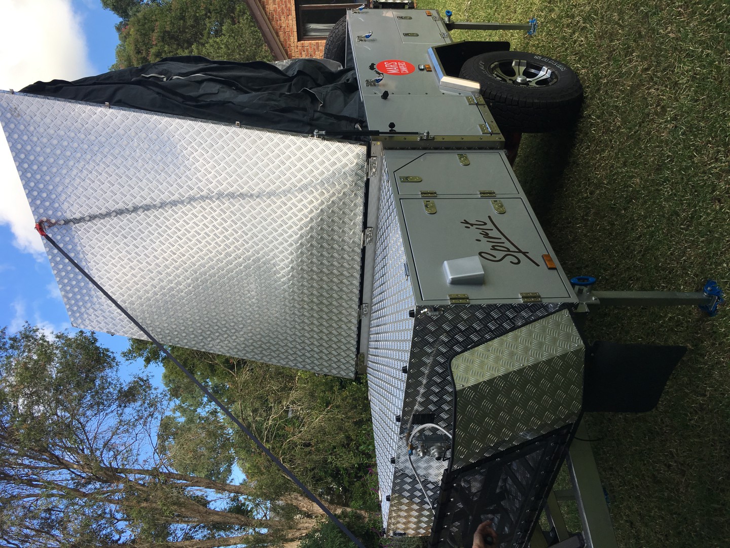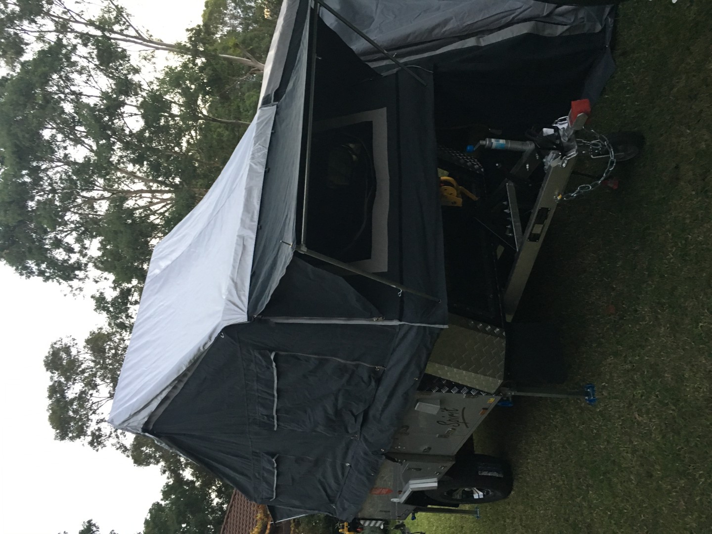 Mars Sprit 2Pac forward folding camper trailer 2017 model. Good condition all over. Standard features include slide out kitchen, fridge slide, queen sized mattress, inside table and seating which converts to a double bed, full all round canvas awning, 2x 9 kg gas bottle holders, 2 x jerry can holders, 2 spare wheels, 120 litre stainless steel water tank, 2 x100 amp hour deep cycle AGM batteries and full off- road suspension. Shock absorbers have recently been upgraded to Pedders ones and new bearings and brakes have been fitted. Non standard additions include a Projecta DC-DC battery charger with solar regulator and input via an Anderson plug, 240 volt charging input via an Anderson plug , Alko 3.5 tonne off- road towing hitch, Alko heavy duty jockey wheel and a rear mounted mesh compartment suitable for carrying firewood. Included are a 12 volt shower with privacy tent, Thunderbox toilet and 1 set of spare wheel bearings.