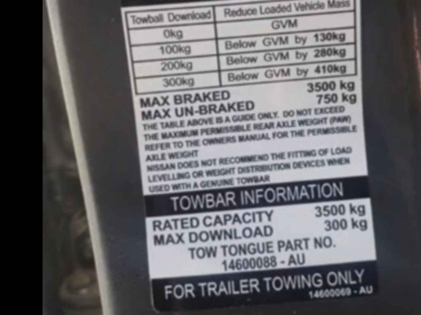 Perhaps you could ask your Nissan dealer to explain why your car. which has a claimed factory towball weight of 270kg, now has only a 200kg limit?