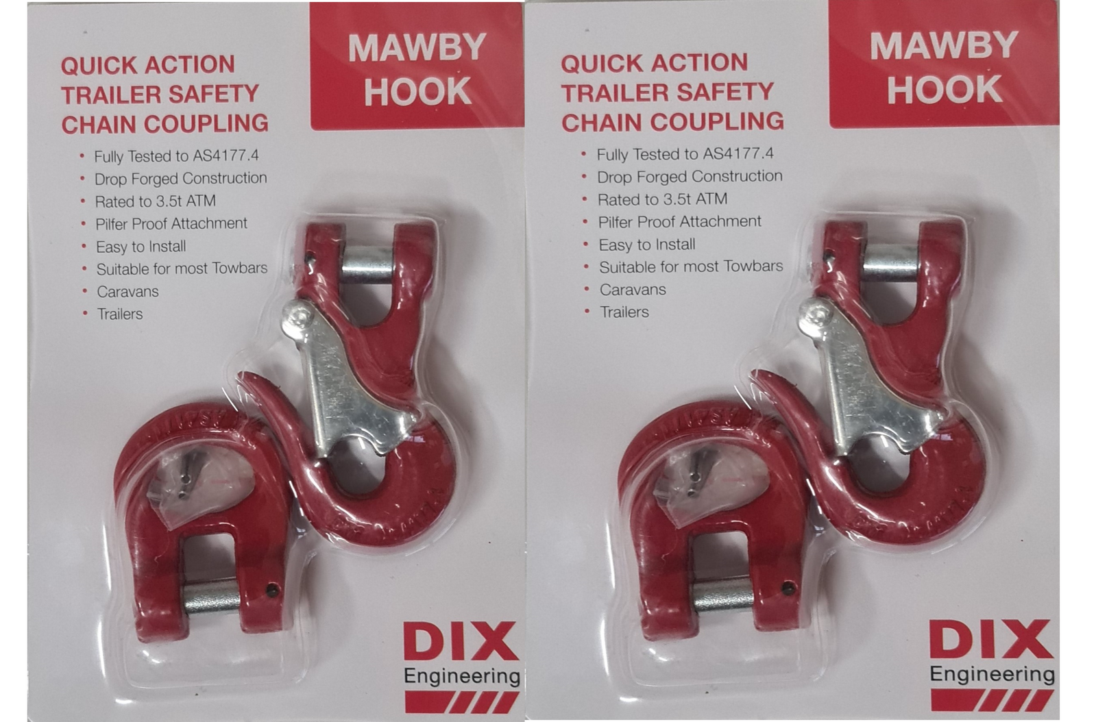 Our product's chain size is based on the ATM (Aggregate Trailer Mass) according to AS 4177.4 section 6, up to 3.5t. A 13mm or 16mm G80 chain is required for loads greater than that. Our labels have been adjusted to reflect the two standards involved. The hook conforms to AS Standard 3776:2015, and the coupler conforms to vehicle standard AS4177.4.