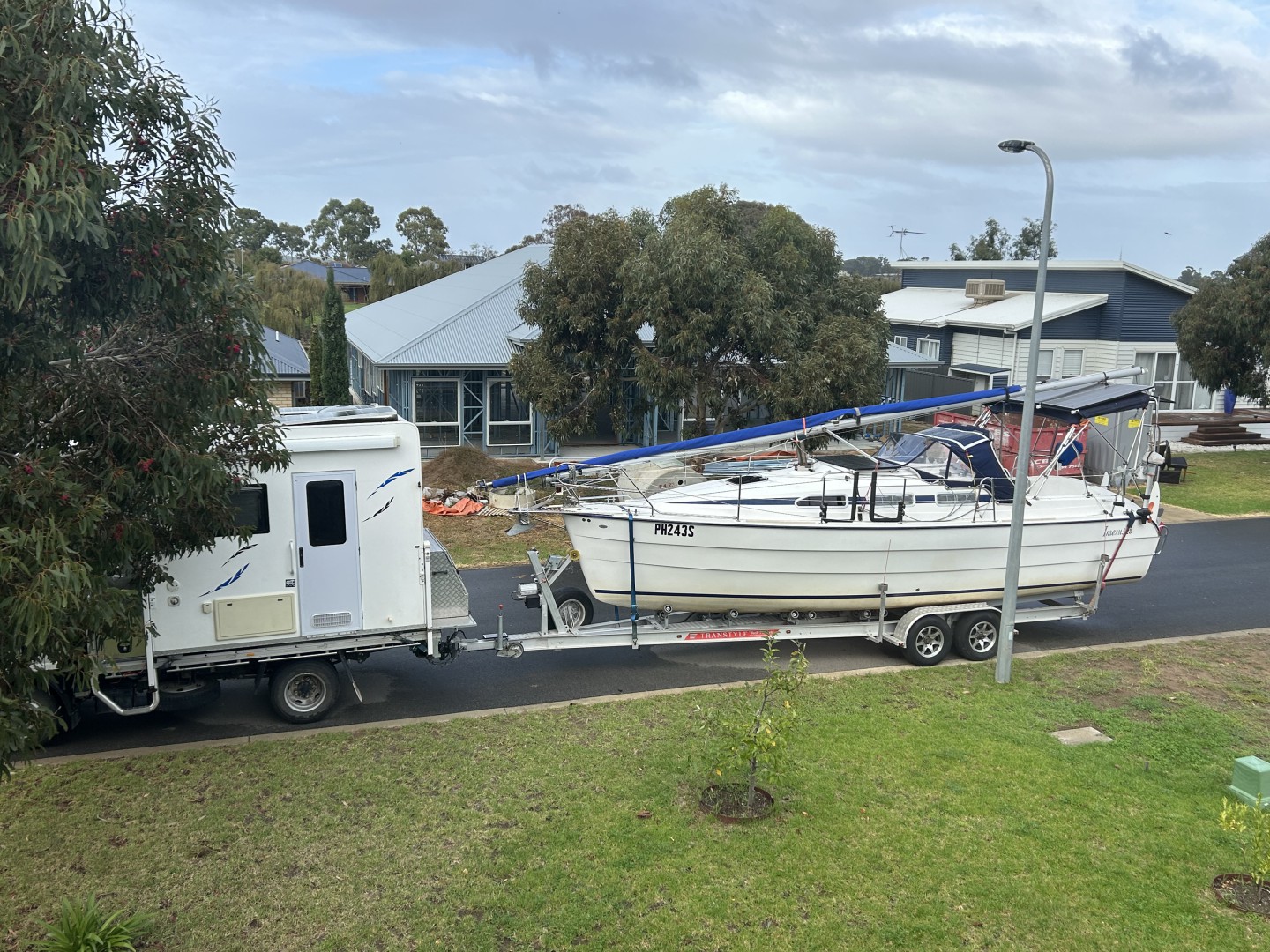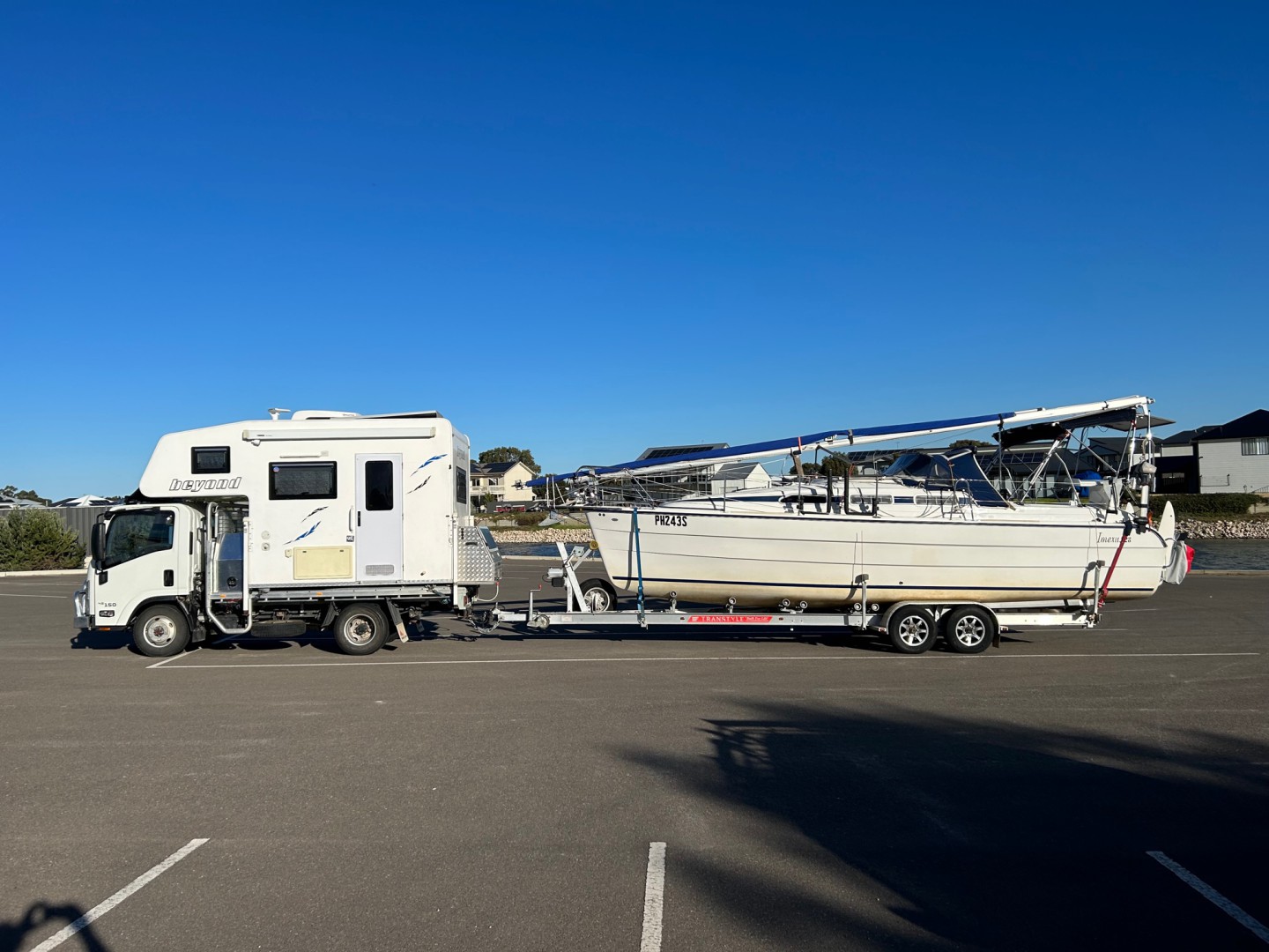 Both early retired now the slightly slower towing journeys dont worry us and its easier on the yacht on trailer at slightly lower speeds as well. The lower speed and shelter behind the tall slide on camper also allow much of the cruising equip on the yacht to remain erected saving the previous huge deconstruction and reconstruction project at the beginning and end of each tow to a remote cruising ground.