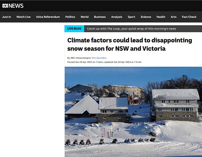 My take on the article is that in April there was a prediction that climate factors COULD lead to a poor season. Current readings are that one place in NSW is well above average, while Victoria is a little above average. My experience has shown that the quality of the season is dependent on rain and temps in April/May to get the ground cold and wet and so hold any snow that falls. That has happened this year.
