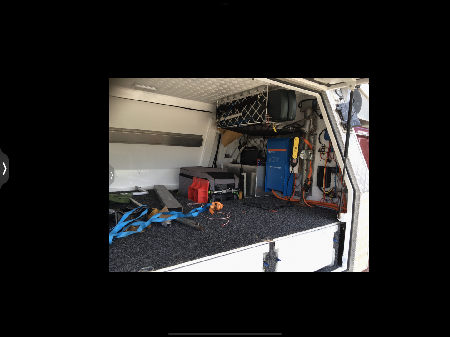 There is plenty of room for a mattress, and to sit-up in bed, as well as sit on the floor having a beer under the shade of the doors, with your feet on the rails. Fishing rods are hanging from the roof, and up front I have 2kw inverter for 240 volt, power coming from 2 x 90ah Victron Lithium batteries. Because I ran out of space on the canopy roof I have one big solar panel on an extension of the canopy, over the car roof.