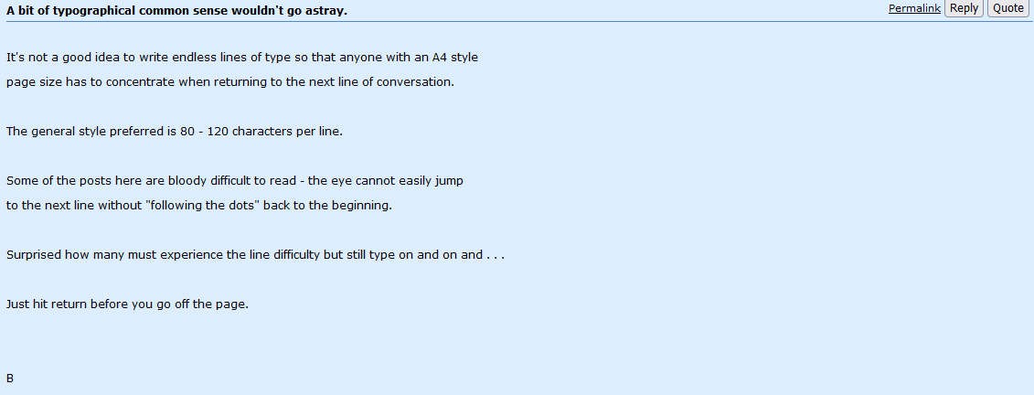 Some of the posts here are bloody difficult to read - the eye cannot easily jump