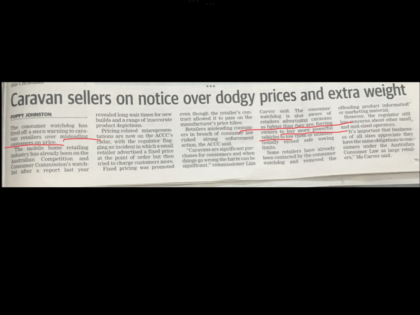 An article in today's paper is warning of dangers involved in buying a caravan.