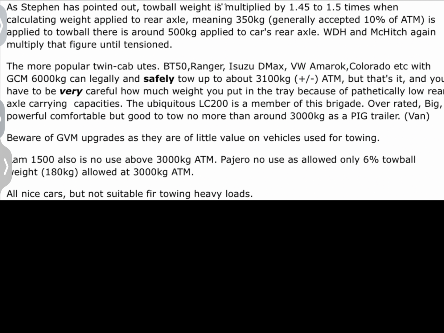 The Landcruiser 200/300 fares slightly better but only just. Its rear axle capacity is greater, but it is heavier to start with so no real improvemnet. Neither would be acceptable to tow 3200kg.