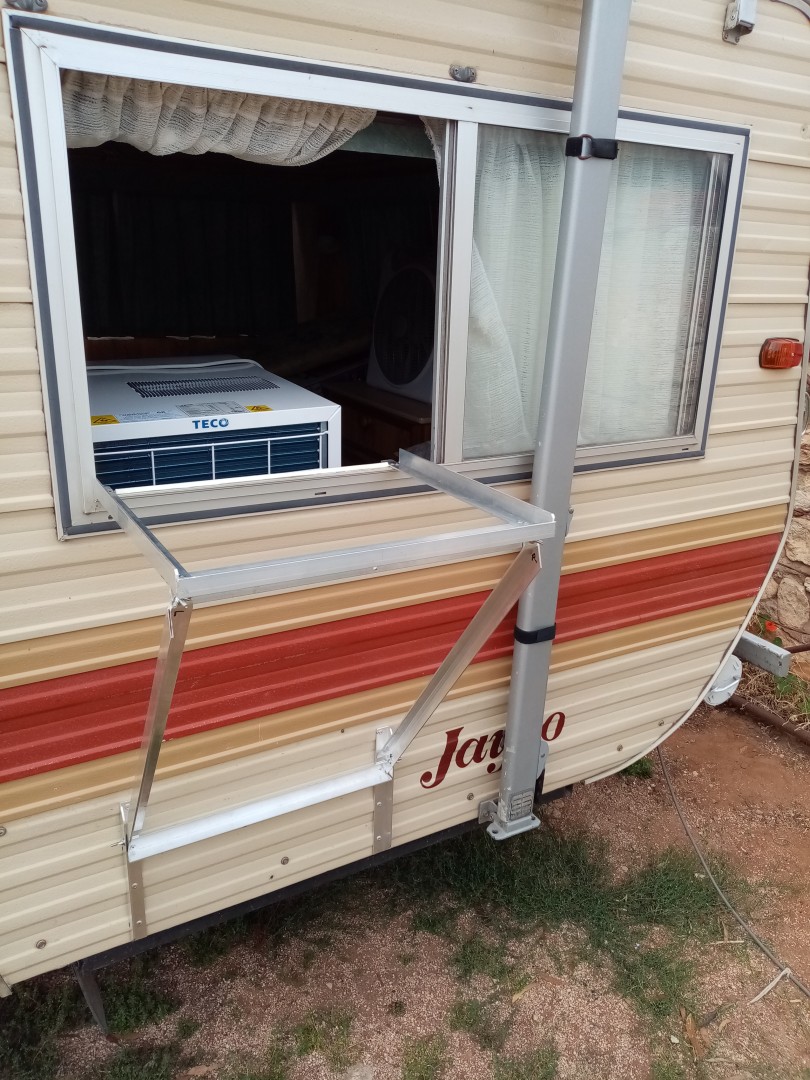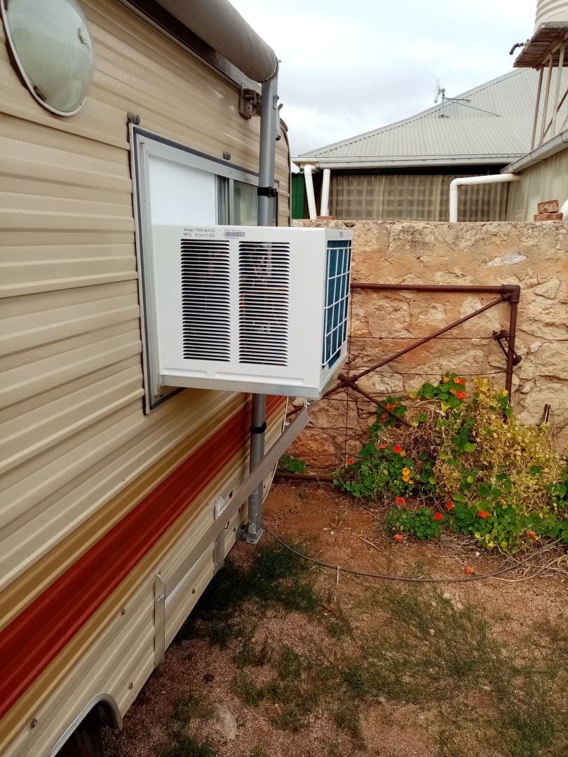 What are we doing we are waiting for a tech to come out and check what he needs to install a household split system, the airhandler will be in a mogified overhead cupboard and the compressor unit will mounted on the back wall of the caravan.