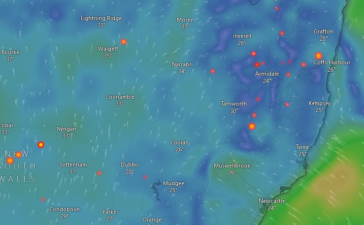 This snippet shows the fires in northern NSW with a background of wind direction and intensity. But seeing it in motion makes it come to life.