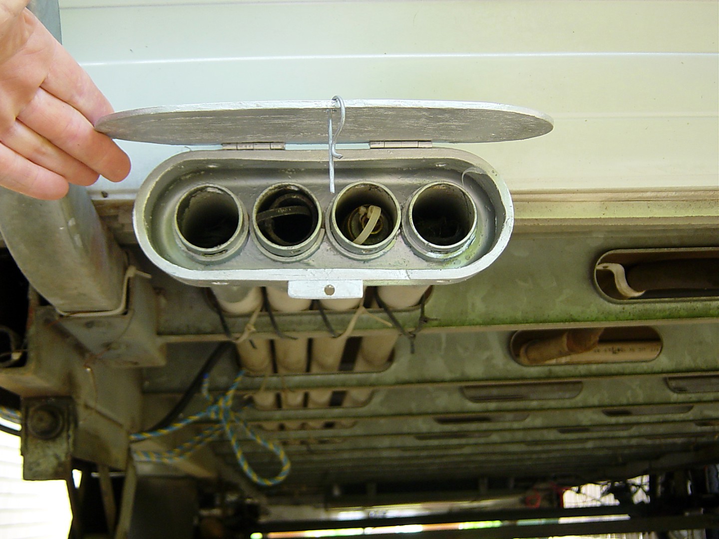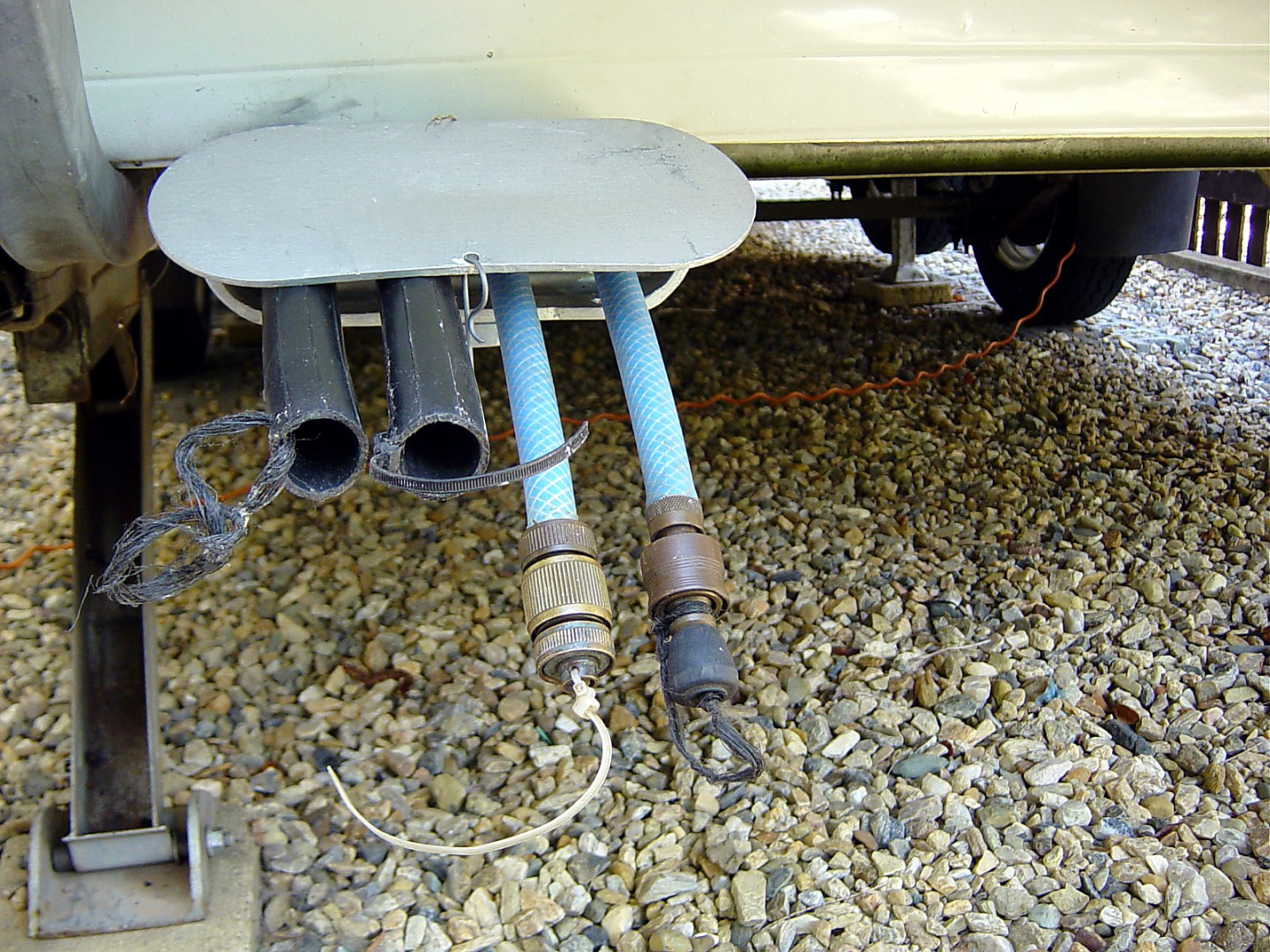 For sullage pipe & water hose, I have fixed 4 conduits, threaded through slots in the chassis under the van. The far end has a cap fitted to each of the four pipes & a hinged cover (I think it is called a 'Plumdinger') to the other. The water hoses are fitted with hose joiners & sealed with rubber feet and clip lock tap fittings. The sullage pipes, when in use, are joined with short pieces of suitable sized conduit. This arrangement lets me store two, about 7M STRAIGHT lengths, of each. I always run them through a rag to clean the outside of the hoses when I feed them into the storage pipes. This way the pipes & hosed are always straight & not coiled. An easy way to store them by just feeding into the conduits with no coils & always clean when pulling them out of storage.