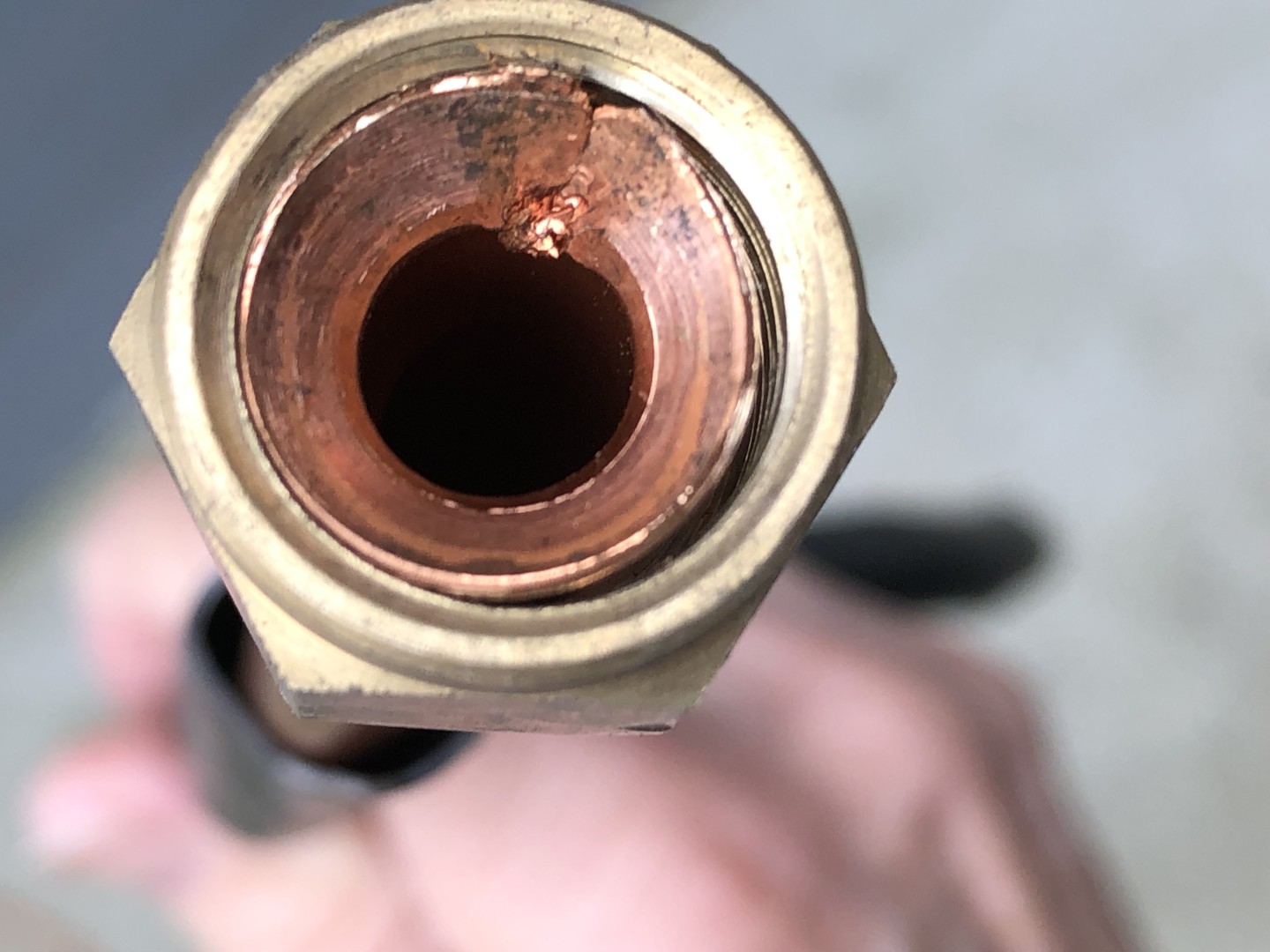 I had the gas line and fittings removed and an inspection confirms the flare on the copper Gas line at the connection point to the three (3) way gas Tee fitting on the LH side was malformed and split substantiating there was a Plumbing Legislation Contravention and it is the result of the Gas Leak detailed in my complaint.