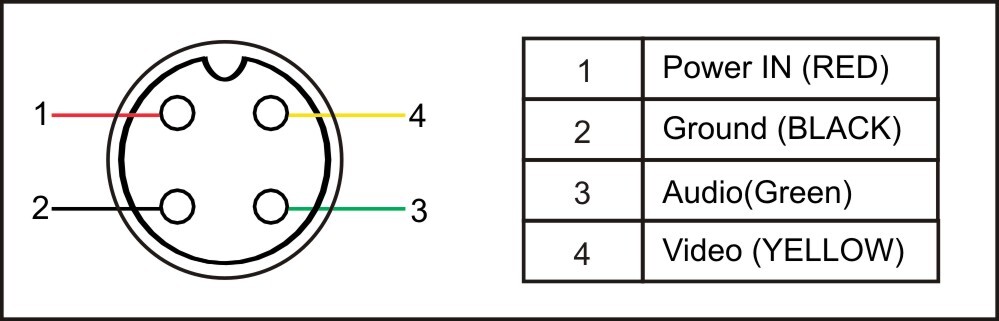 I fitted and connected the caravan reverse camera using 4 pin aviation plug/socket and 4 core insulated cable with Red/Black/Yellow/Green or White wiring.