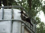 This is a pix of the magpie we are feeding, could someone tell us what to do, whether to continue to feed him, or to catch him and adopt him, Have a good look at his beak, At the moment he is learning to eat with a sideways motion, laying his head on the side to pick up food, its mother still occasionally feeds him what happens when we go walkabout??