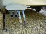 Where the site is a long distance from the sullage point and the van has two discharge outlets as mine does, a lot of pipe is required. Make a "two pipe to one" anti backflow adaptor. This is done by attaching 600mm lengths of sullage pipe, one into an elbow & the other into a T joint. Connect them together to form a reclining F shaped fitting to form a single outlet with two inlets from the van side. Your sullage pipes can now be joined together to make one long one. Some people use this attachment in all situations.