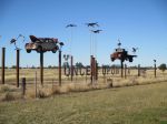 Gaylehere, just to fill you in, the croc is actually a Kronosaur, and it is out the front of Kronosaurus Corner (should be spelled with a k but auto correct wont let me.), the exceptional dinosaur museum at Richmond. Well worth a visit. It is sitting in a water feature, as a marine dinosaur, but the mushroom thingy is actually one of Richmond and the surrounding areas famous Moon Rocks. These rocks when split open often contain fossils. Just wanted to give you the info so you could Google it if you wanted.