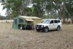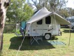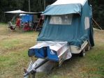 yeh i'll be there at the southern tow bars stand on sundayconfuse I just bought a home made camper trailer off of ebay, had to drive to melbourne to pick it up but i think once i've changed a few things arounf it'll be worth the drive,, it's based on an 8x5 box trailer, it's more of a mobile camping kitchen really with aravan gas/electric fridge, 2 burner gas cooker and a sink with water tank and 12 volt pump all installed thats 1 half of the trailer the other side is storage, it's wired for 12/240 volt power and with the addition of a solar panel and a small generator we can be fairly self contained,, it has a home made roof top tent but i doubt that we'll use it, i'll keep it on as it acts as a shelter for cooking in the kitchen, all this for $1400.00 plus $150.00 in fuel to go and get it seemed not to bad to me,,, the trailer is a heavy duty one at that and as well like camping with our oztent i see this as the ideal hook up and go for us for the time being anyway as the "big trip" is , by the looks of it still a long way off and shorter trips will be the order of the day for us for the time being, well best i get back to getting it ready for our first shake down trip in a few weeks timebiggrin