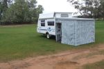 An earlier owner made the brekky nook into a permanent single bed, with the table still there, so one has to sit kind-of side on to the table. A couple of girlfriends are eager to trip with me at times, so I'll leave it as a single bed. But it'll probably all have to be raised to fit the porta loo under there. Some Dan-ifying will fix that. Mind you, I don't know how I'll go with the loo if a girlfriend is with me. I like to have the loo nearby at night.