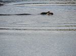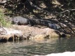 Some photos of five different sal****er crocodiles on 2kms of the lower reaches of the Mulgrave River in Nth Qld (River is Freswater here but not far from Brackish/Salt). As long as people heed the signs erected there should not be any incidents, but there have been some seen close or in these waters.!!. The photos were taken at 9:30am on Friday 16/08/2013, we did not realize what was to unfold as the croc was stirring slightly, then aggressively and the body of a wild pig floated up beside him. The photos of the pig hanging from his jaws were taken from a 100 ft high bank as he slowly floated down river.