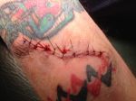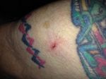 Gday.I.m 63 and I go to a skin clinic once a year for an outer body service so to speak.My lady doc said that the tiny freckle on the inside of my upper right arm was still the same as last year but she suggested that we remove it. This was done as you see the next day [3 weeks ago].Well last week she rang to say the tests indicated that it was malignant. Thesecond photo was yesterday as the nurse was about to bandage it up.Its 4" long and the doc was nice enough to angle the work around my tatts ! [old biker stuff !] So folks get those spots checked out !!!