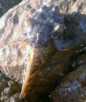 I dunno, about 15 inches.I just had a smaller one for tea , and can truly say it was well worth the effort.I bloke in a patrol, with his family, said that the Hideaway bay van park charges $55 a night, and will magnamously drop it to $46 a nt next week. Real nice of them.He was looking for a free camp spot. They have a hide,some of these operaters. Got a strange fish off the rocks in front of the camp. Its called a "frog fish", but looks more like a toad.Willpost shots if it comes out. .See ya soon, Bill