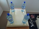 Today it was time to get started with the middle part of the top lid. Pictures show you what I've done. This thing turned up as a pan cake too as you can see (the gap) so I had to go and use dirty tricks again. The idea is, to keep it flat and even with the water bottles and making up an epoxy matrix to keep it that way after the bottles are removed. Hope I can apply the second "matrix" layer today but the humidity is on 250thousandmillion percent and it takes ages for the epoxy to cure. I'll see......