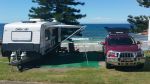 Some places we went you didn't have a choice but to hit dirt and the caravan took it in it's stride, albeit we had to take it slow and steady. We are living in our van so we wanted all the comforts, doing a lot of free camping. Having the washing machine comes into it's own when you pay $4 or more for a small load in a caravan park. A wash board and tub has to be stored somewhere and storage space is at a premium. It's a personal choice about the full oven, however at times the weather doesn't permit outside cooking and we have used our oven frequently, if you have it you use it. We have the café fold back table in the dining and would have liked a power point near the table for ease of plugging in the computer. A generator box area in the van would have been handy, which we don't have. We did get Jason to fit pelmets in the van, as well as the block out blinds and Lainie made sheer curtains. Just a personal choice, but when you have the block out blinds down everyone can see straight through the van. The outdoor shower we have not used, but you may like that option. The drop down table on the outside should have a 12 volt connection and TV antenna connection, we don't have this and wish we did. At times sitting in our annexe it would be nice to watch the footie with friends. Once again that's a personal choice. Oh.. and one thing we don't have is 2 filler caps for the 2 water tanks. I think Jason has corrected this now, but trying to fill the water tanks from one inlet is time consuming and fiddly.