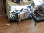 Now we have two dogs we have decided to go the way of a pen when travelling.We have just purchased a THF Handler Exercise Pen which is eight 2'x2' panels that can be set up in numerous configurations and folds flat to travel on our bed. It is large enough for two camp beds and there is still some room for them to walk around, though they certainly get enough exercise throughout the day with their many on-lead walks.