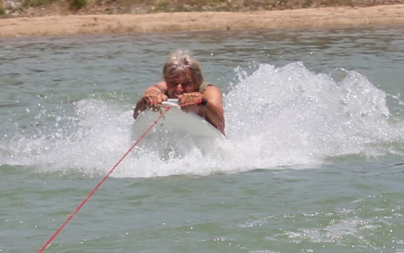 Later and I went to the lake and was given instructions on riding the knee board. Yeah right, all you have to do is to hang on as the boat builds up speed and when given the nod you just pull yourself up on to your knees. Well I hung on all round the lake but didn't even try to haul myself up on to my knees it was hard enough to hang on with out upsetting the balance by actually moving. I must admit that I enjoyed the experience and possibly could improve with practice but I think that enough is enough. John