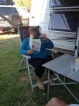 Now the third photo is of a lady, holding the grass nicely, preparing to enjoy 4 vegies and meat at the her dinner table. That's a camp dinner. Winner.