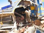 So I yelled for her to reverse, she looked at me and then fumbled for the right gear,,, too late - grader backed straight into front LH side of the bus.
