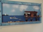 The small seafood café is made from teak and boats and birds are all had made . It gives the realism a different aspect. The frame is handmade and carved.