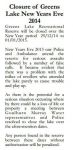 It was stated at least twice during the interview that Greens Lake will closed on 29 Dec and will not opened until 1 Jan - the words were not actually spoken that there would be "no camping" during that period, but it was stated that "the Lake will not be available during that time".