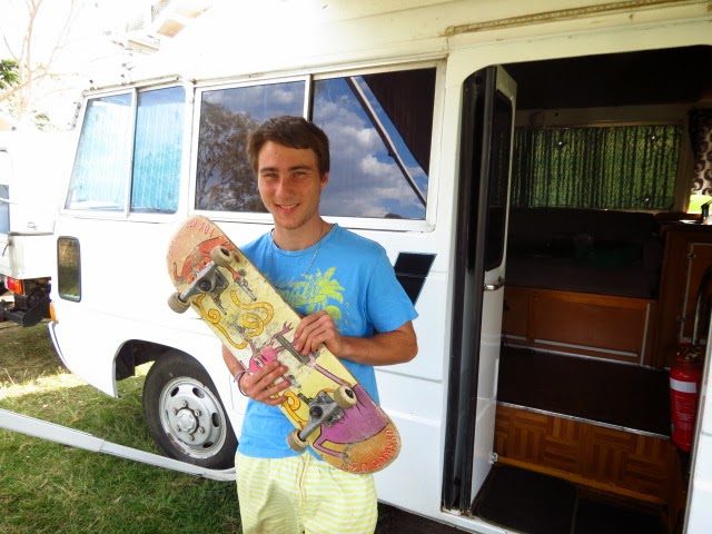 Met a young man yesterday who looks to be ready to jump into the big time in skate board riding, he has been skating since he was 5 and now is 17. During that time has broken his legs, arms, ribs and had a cracked skull. He is sponsored by Nike and has won many competitions locally as well as Australia wide and has been invited to Los Angeles to compete in a world class event next year. His photo will appear on the front page of the next skateboarding magazines in Australia. Corey Flick is his name and he is living with his Grandfather near to the bridge and was boarding past the camp when we met. John