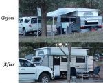 5 minutes later all had settled. The neighbours tent trailer now had another set of guy ropes bolting it down to mother earth, the ringing in my ears had finally abated, and all I had left to do was to de-construct my roll out awning before the wind really got strong!