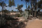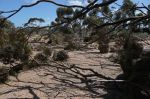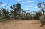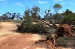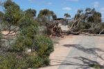 Drove from Norseman to Woorlba Camp 50 km past Balladonia on Tuesday. An attractive camp I stayed at in July. WELL - what a mess. There had been a mini typhoon through the camp on Monday night. Tree uprooted which missed the loo by inches, and branches down everywhere. Not a tree in sight that didnt have some damage or had been uprooted. A motorhome lady and I managed to drag a tree out of the way so we could get to the camping areas. I wondered if anyone was back there during the storm - maybe not as the track out was blocked. Odd thing was it seemed such an isolated hit. Still trees around the emergency phone 100m up the road and only one on the ground over the road.