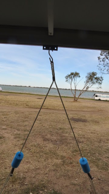 It has been a very hot windy day today and because I haven't used the front shade across the awning there was room to put another support in the centre. This is how it works, take a 2inch hinge and remove the pin inserting the single side of the hinge into the sail track and putting a metal hook into the hinge add a double tie down. This has been around for some time but there may be some who are not aware of the easy idea. The noodle cut downs are to increase visibility lessening the chance of tripping over the pegs.