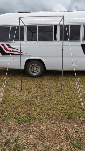 The balance of the day was taken up with packing stuff away and pulling down the TV antenna, had to return to Mitre 10 to take back some shower curtain clips. The clips supplied looked like they would break if opened sufficiently to slip over the pvc pipe so I returned them in favout of metal ones that easily slip over the pipe and hold the shower curtain with the other clip. Have taken photos of the unit minus the shower curtain both erected and clipped to the bus. So no TV tonight and all packed up ready for a flying start tomorrow.