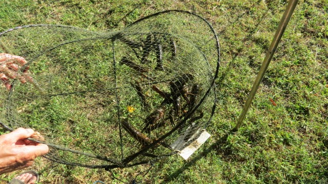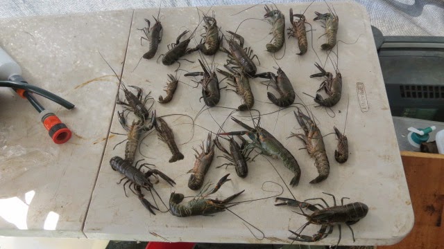 Well today was a dismal day for red claw, pots 3 red claw 0 but there is always tomorrow. Here we are tomorrow Friday and the tables were turned pots 3 red claw 24. So many I brought one net back to the bus to deal with, wasn't keen to have a couple get loose into the kayak and start getting their own back. I remember Roy's experiences last year when he caught one and it bit him twice.