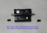 Reassemble the mechanism and make sure the latching lever can pivot freely before you fit the two halves of the mounting shell back together. The screws holding the metal plate are tightened just enough to hold them firmly in and to allow free movement of the latch (some low strength loc-tite could be used here). If the mechanism seems a bit rough and sticks when it pivots, you may need to smooth off any excess glue that maybe jamming it against the mounting shell, using a tiny file or even a nailfile.